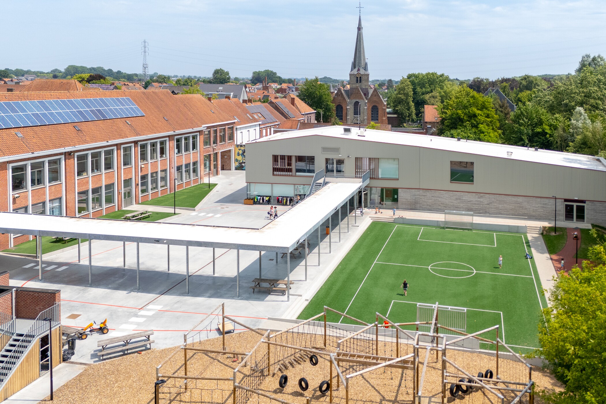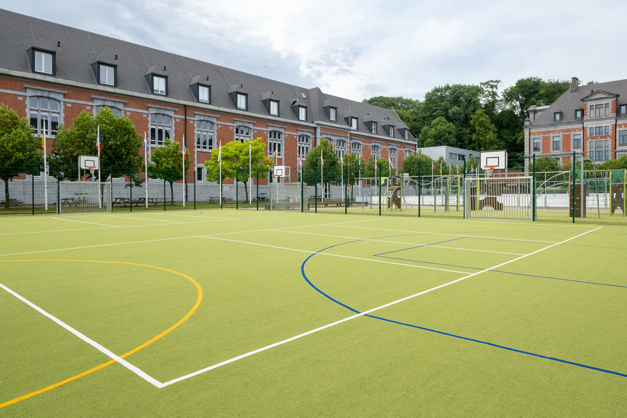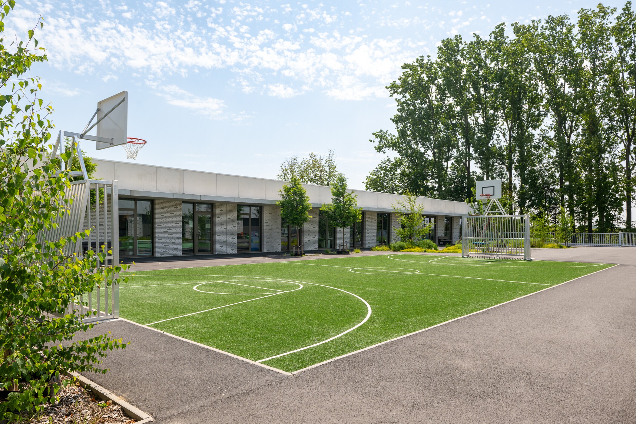 Op de school realiseerden we een multisportveld alsook stonden we in voor de groenbedekking onder de speeltoestellen. De belijning en uitloopzone werden volledig op maat ontworpen, voor een inclusieve buitenruimte waar iedereen zich kan uitleven.